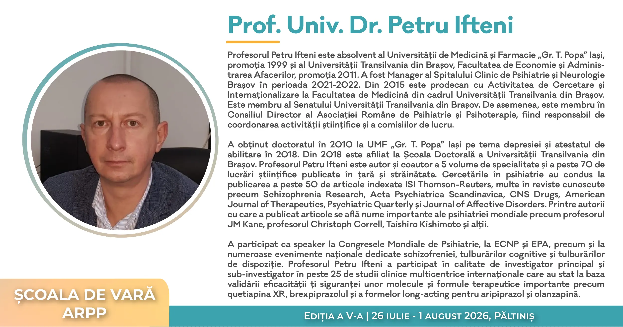 Avem plăcerea de a vă invita la cea de-a V-a ediție a Școlii de Vară A.R.P.P., organizată de Asociația Română de Psihiatrie și Psihoterapie în parteneriat cu Spitalul Clinic de Psihiatrie „Dr. Gheorghe Preda” Sibiu, Facultatea de Medicină din cadrul Universității „Lucian Blaga” Sibiu și Asociația Medicilor Rezidenți în Psihiatrie din România.