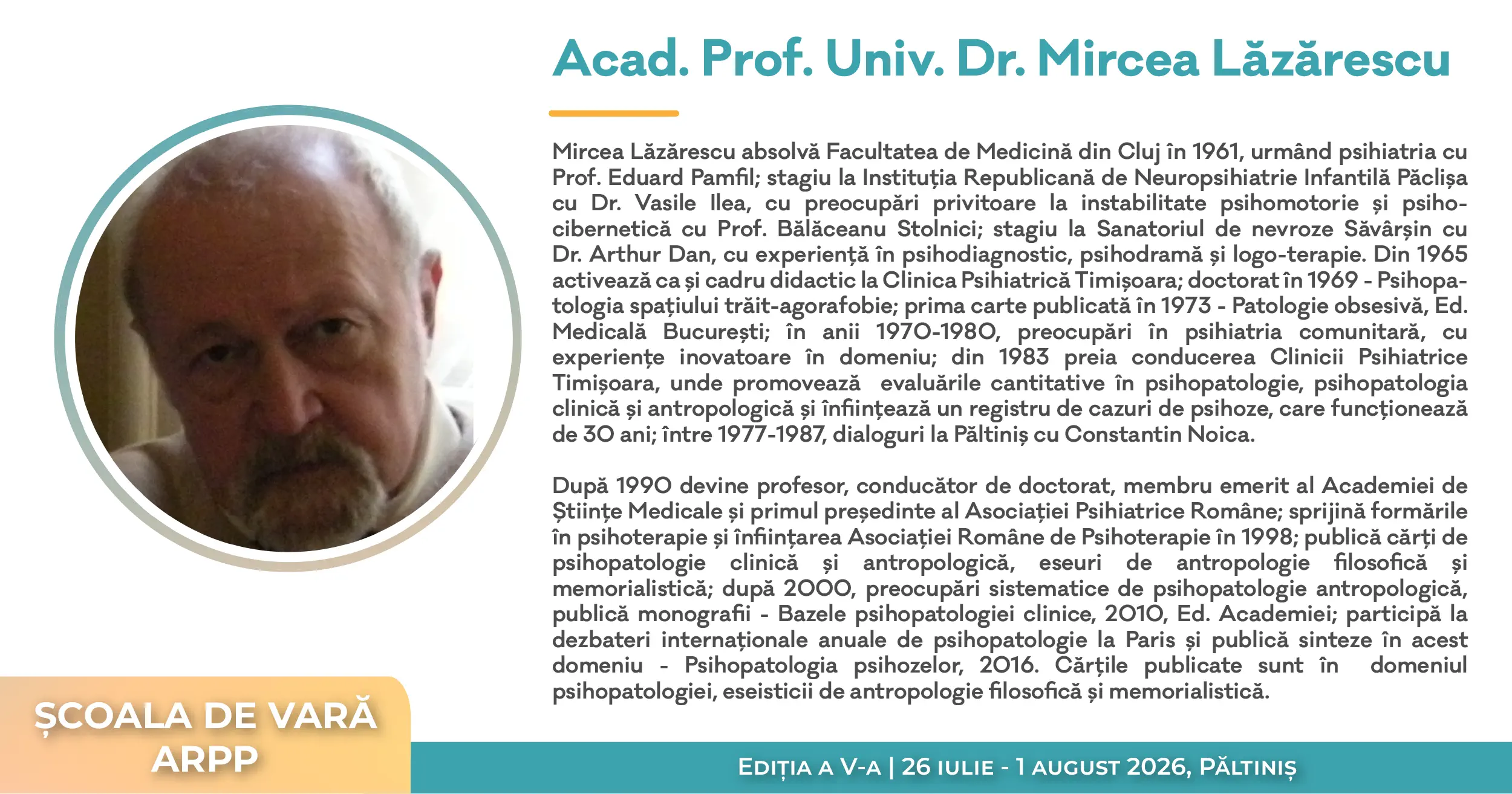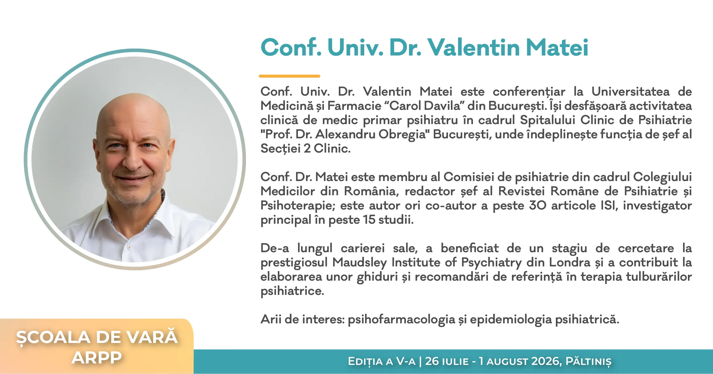 Ediția din acest an a Școlii de Vară A.R.P.P. își propune să ofere participanților o incursiune aprofundată în domeniul psihopatologiei și psihofarmacologiei, cu accent pe cele mai recente descoperiri științifice și aplicații clinice relevante.